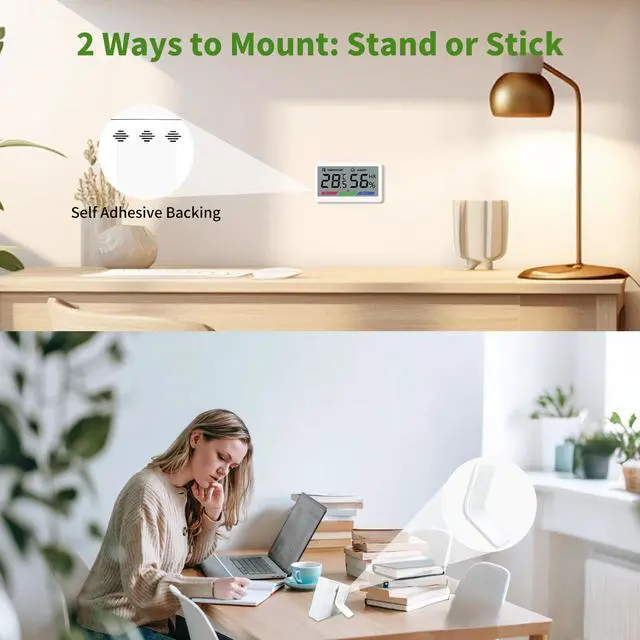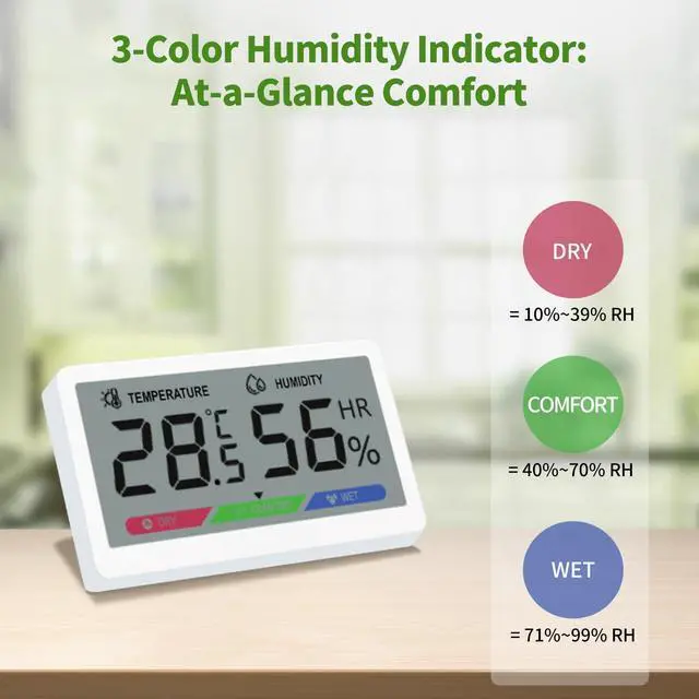Our hygrometer’s 3-color icons signal dry/comfort/wet air instantly. Skip squinting at digits—adjust your humidifier/dehumidifier in seconds.