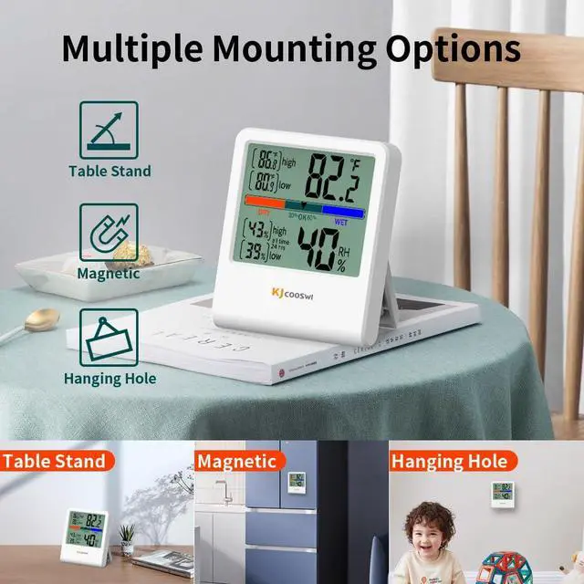 Multiple Options: The home temperature monitor can be hung on a wall, placed on a table, or attached to a metal surface with magnets; easy to see and operate, blends perfectly into home decor.