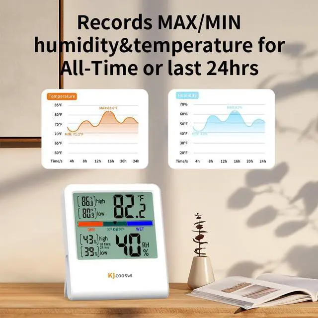 Max/Min Record: Hygrometer displays maximum and minimum records for the past 24 hours, instantly identifying changes in temperature and humidity so you can maintain a comfortable atmosphere.