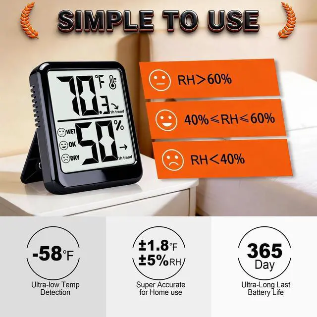 - You will get: 1 x room thermometer and humidity gauge (2x2.6 inches); 1 x AAA battery.