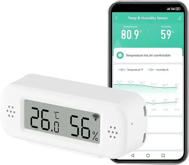 • Smart Digital Thermometer HygrometerThe intelligent indoor digital temperature and humidity meter supports 2.4GHz Wifi. With the latest chips, it offers more accurate temperature and humidity measurements in both Celsius and Fahrenheit with ±5% RH and ±1 degrees Celsius.