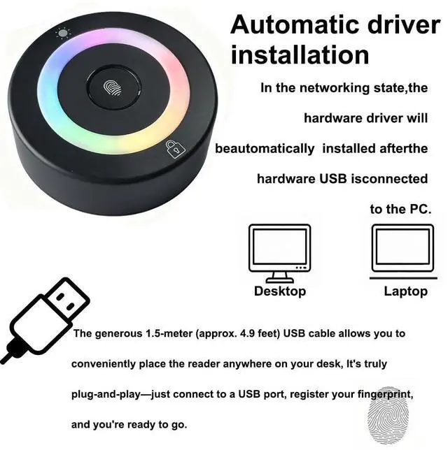 Plug-and-Play + 1.5m Long Cable - Works with genuine Windows (no drivers needed, 95%+ compatibility). 1.5m (4.9ft) USB cable for flexible desktop placement. Just connect, register your fingerprint, and use.
