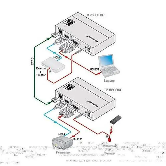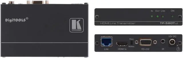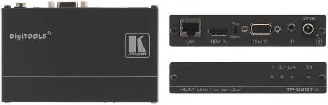 The TP-580TXR is an extended range, HDBaseT twisted pair transmitter for HDMI, bidirectional RS-232 and IR signals. The TP-580TXR inputs HDMI, RS-232, and IR signals and converts them into an HDBaseT twisted pair signal that it transmits to a TP-580RXR receiver.