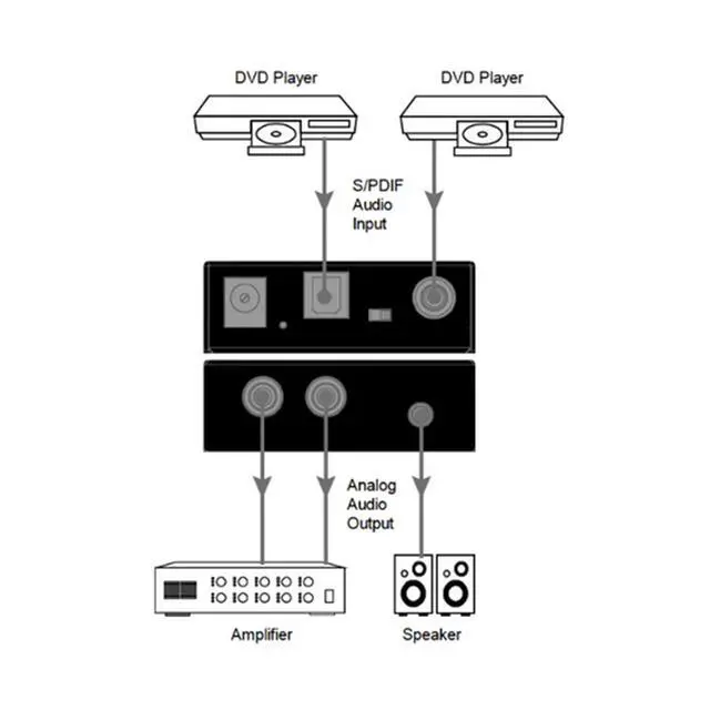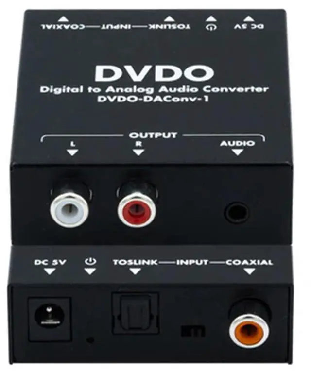 This product is a digital S/PDIF to analog audio converter. It can convert multichannel digital audio to stereo analog audio. It features one optical and one coaxial digital S/PDIF inputs up to PCM 5.1 channel, two analog outputs simultaneously on the 3.5 mm headphone and the L/R RCA connector.