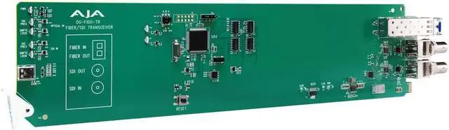The OG-FiDO-TR from AJA is an innovative and high-quality openGear compatible 3G-SDI/Fiber transceiver, expertly designed for professional video and audio applications that require reliable signal conversion. This advanced transceiver supports both 3G-SDI to Fiber and Fiber to 3G-SDI conversions, ensuring seamless integration into a variety of broadcast, production, and post-production workflows. Crafted with durability in mind, the OG-FiDO-TR allows for extended cable runs up to 10 kilometers (32, 808 feet) when using single-mode fiber, making it an ideal solution for large venues or complex studio environments. Its compatibility with high-density openGear 2RU frames, including AJA's own OG-X-FR frame, underscores its commitment to industry-leading flexibility and cost efficiency.