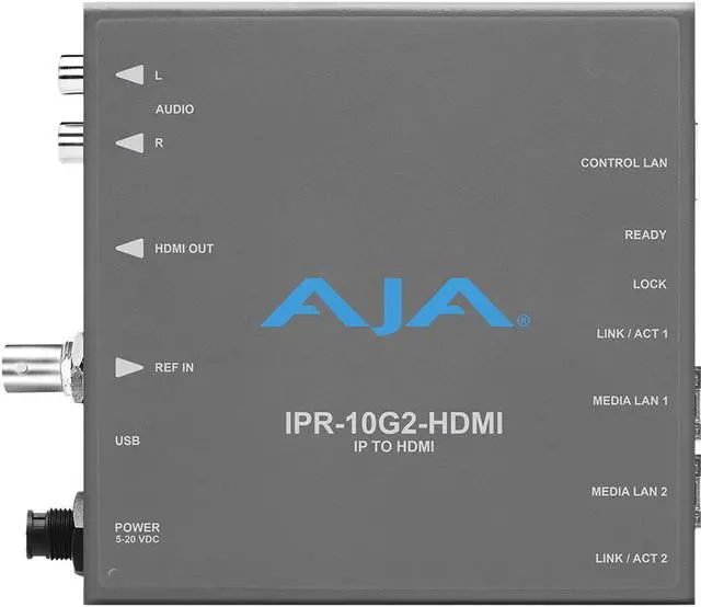 Its rugged, fanless, Mini-Converter design is perfect for placement in a variety of display and device scenarios, from studios to field locations. The IPR-10G2-HDMI is a SMPTE ST 2110 to HDMI Mini-Converter suited for point-of-use applications, including source monitoring and providing an HDMI feed to compatible devices. It receives SMPTE ST 2110 IP video and audio, then formats the data for output on a full-size HDMI 1.4 b interface. The IPR-10G2-HDMI is designed to provide HDMI output from SMPTE ST 2110 video and audio over IP streams. When combined with AJA KONA IP for HD, it can receive UltraHD or HD from servers and more, creating a real-world ST 2110 workflow for video over IP production and monitoring.