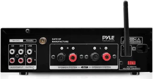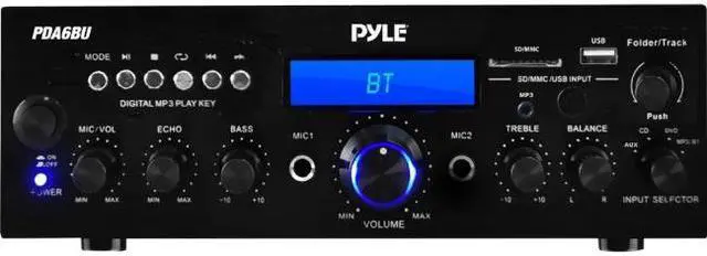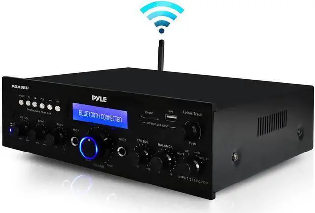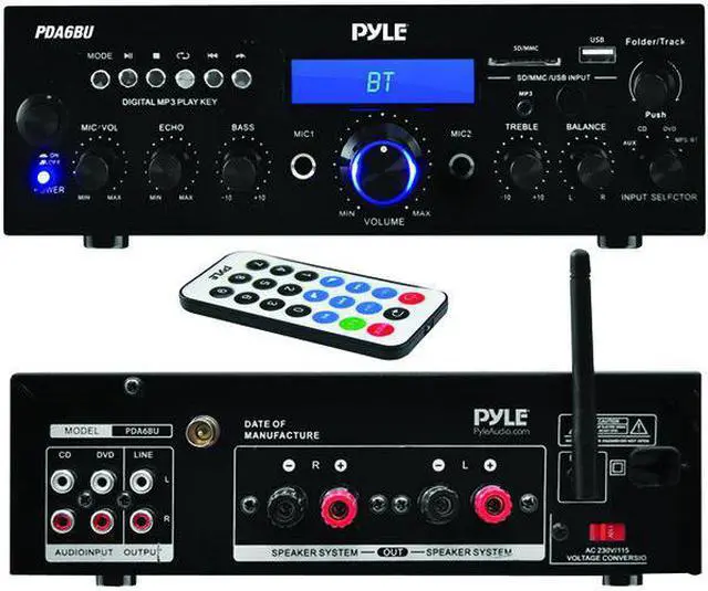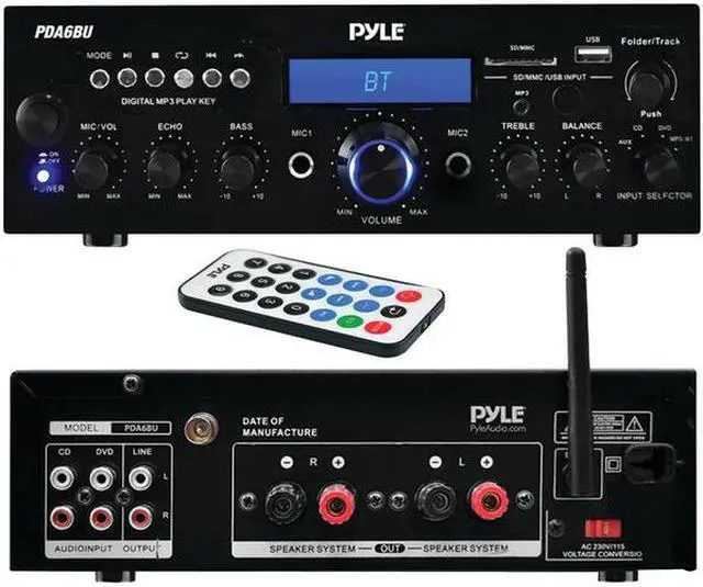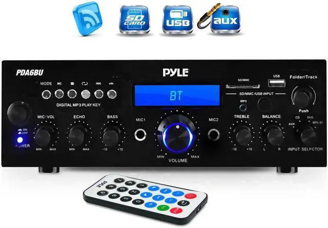 Pyle Home PDA6BU 200-Watt Bluetooth Stereo Amp Receiver with USB & SD Card Readers200W @ 4ohm max, 100W x 2 @ 8ohm RMSBluetooth (R) FM radio with LCD digital displayUSB & SD (TM)