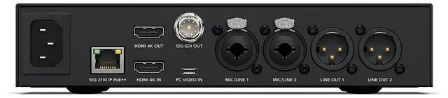 Bring your presentations to life with the Blackmagic 2110 IP Presentation Converter, a versatile tool designed for podium presentations. This model seamlessly connects switchers to computers, projectors, microphones, and PA systems, ensuring a smooth and professional presentation experience. The converter features HDMI and USB-C inputs for video, with the USB-C also capable of powering a laptop. An HDMI output is included for projectors, which can be switched to the video input or the 2110 IP return feed. XLR mic inputs and XLR audio out for PA speakers are also provided, ensuring superior audio quality.