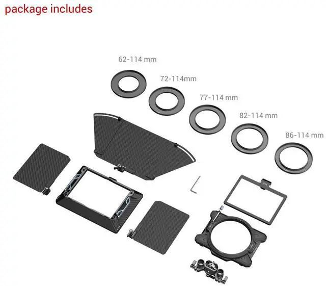 If you're a professional videographer or photographer looking to enhance your camera's capabilities, the Revo-Arcane 114mm Multifunctional Modular Matte Box Basic Kit by SmallRig is an essential addition to your gear. Crafted for mirrorless cameras and cine lenses, this high-quality matte box is engineered to mitigate unwanted sunlight and other light sources that can cause glare and flare, ensuring you maintain control over the imagery captured on screen. The Revo-Arcane series is synonymous with durability and versatility, and this particular matte box is no exception. It includes a comprehensive set of five threaded adapter rings (67-114mm, 72-114mm, 77-114mm, 82-114mm, 86-114mm) to accommodate a wide range of common DSLR lenses and circular filters such as Variable ND (VND), Graduated ND (GND), and Circular Polarizers (CPL).