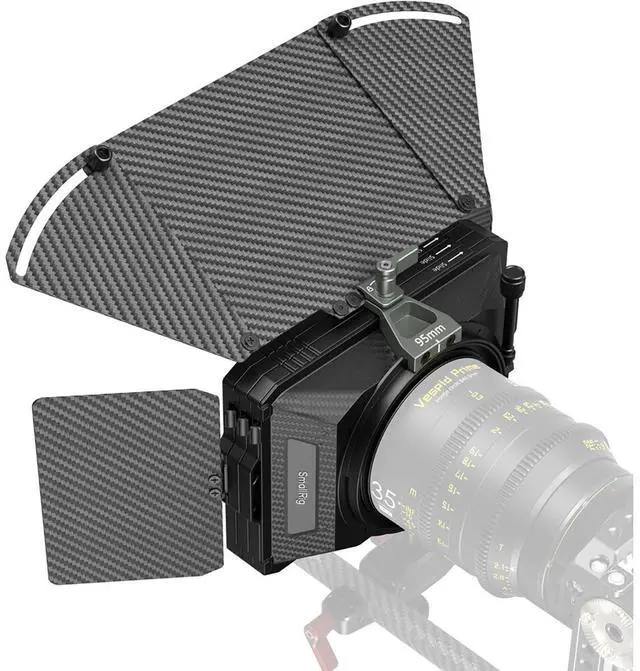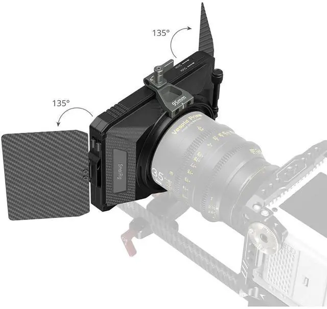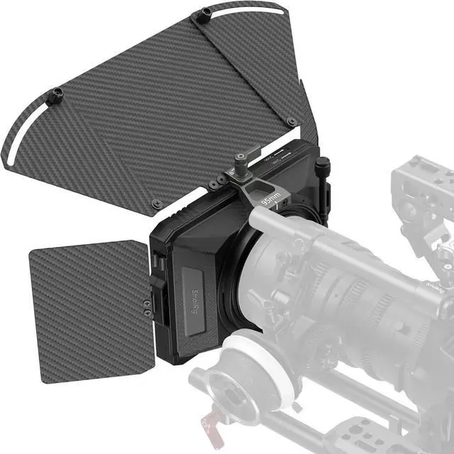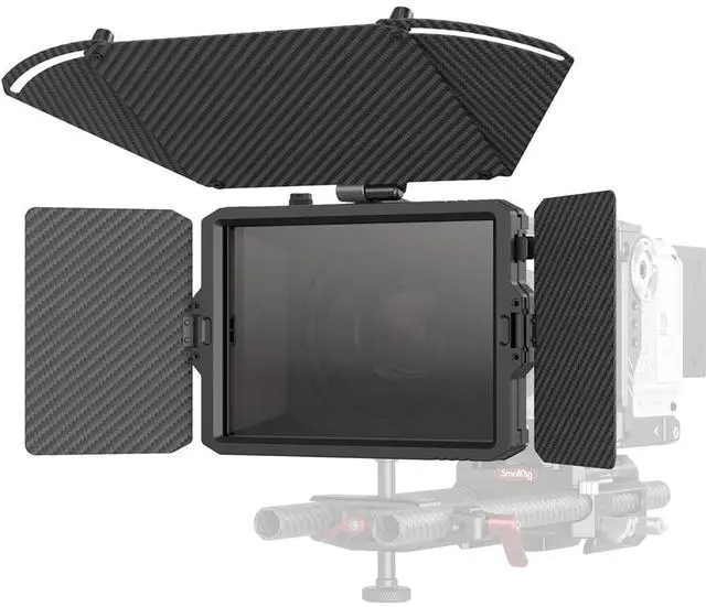 SmallRig mini Matte Box Pro 3680B is designed for video production with mirrorless cameras, effectively reducing flare and maintaining image quality by blocking stray light from sunlight and other sources. This matte box includes two 4 x 5.65" filter trays that can be quickly mounted via a NATO clamp and supports multiple filters stacked together. The top flag opens up to 180 Degree, while the side wings extend up to 40 Degree for an expanded blocking area. The side flag can be attached to either the matte box or the filter tray using a NATO clamp and also opens up to 180 Degree to block stray light.