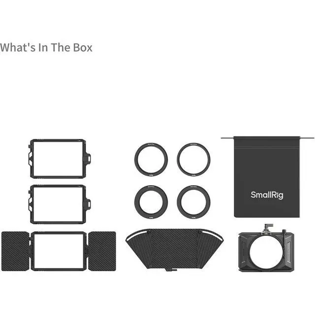 The package includes four adapter rings (67-95mm, 72-95mm, 77-95mm, 82-95mm), allowing for direct mounting onto cinema lenses with a 95mm outer diameter or attachment to mirrorless camera lens filters (compatible with 67mm, 72mm, 77mm, and 82mm filter sizes). A carrying bag is also included for easy storage of the matte box and filter trays