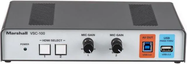 The Marshall VSC-100 AV UCC Consolidator Bridge easily connects HDMI video and professional audio sources to a computer for use in UCC, video production and recording. Simple to use plug-and-play design coupled with a high-fidelity audio front-end makes integration a breeze. Select either one of two HDMI video sources with the flip of a switch. Active loop-through outputs keep sources available for other purposes such as feeding monitors and recorders.