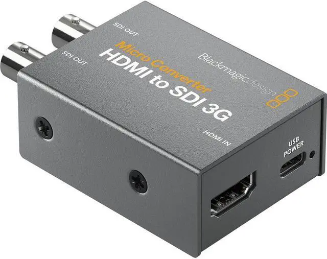 Micro Converter HDMI to SDIThis model is perfect for connecting HDMI cameras and computers to professional SDI equipment! You get two 3G-SDI outputs which can be set to level A or level B formats. Unlike cheap converters, it even supports feature film video formats including 1080p24, 1080p 47.95 and 1080p48. Includes 100 to 240V AC power supply with international socket adapters. You can use Micro Converter HDMI to SDI 3G to convert the HDMI ouput from video equipment such as HDV cameras and game consoles to SDI. This means you can send video signals from HDMI over SDI using the longest SDI cables.