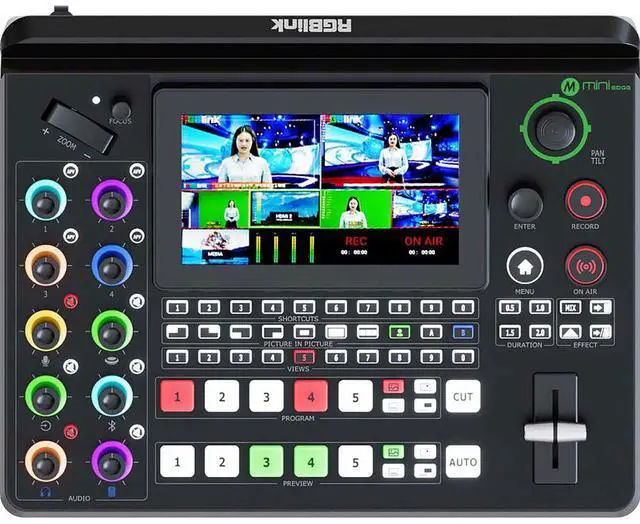 mini-edge SDI is built in with 5.5-inch TFT panel for menu operation and multiviewer video display. Compared with mini-edge, mini-edge SDI has 4 more 3G SDI inputs, a ready-to-be-licensed bidirectional NDI, and also noise reduction for audio inputs. Else it features dynamic output control, multi-view preview, picture in picture, chroma key, transitions, on board PTZ camera controls and much more.