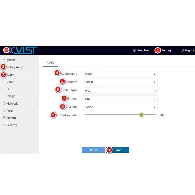 Sampling Rate: 32K, 48K, 64K, 128K, 256K, or 8000Hz (NVR optimized)