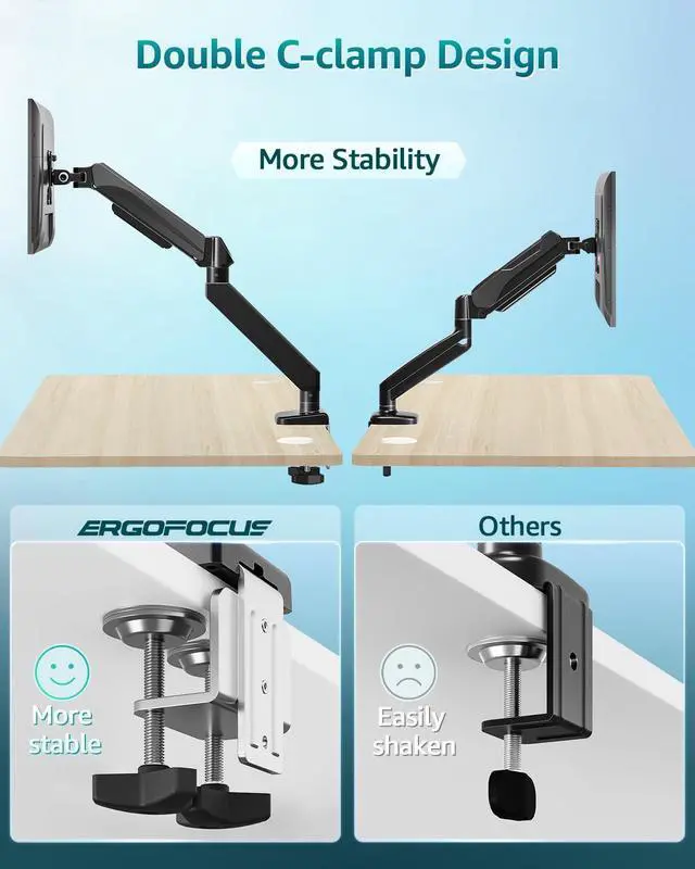 Wide Compatibility: Compliant with VESA 75×75mm/100×100mm standards, universally compatible with leading monitor brands. Dual installation options, C-clamp 0.39" to 2.76")and grommet base(0.39~2.36")offering flexible installation for diverse office setups.