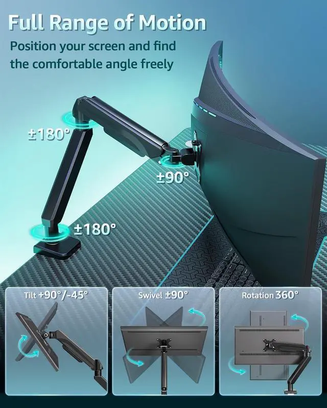 Multi-Axis Adjustmen, Customizable Viewing AnglesThe heavy duty single monitor arm can tilt90°to -45 swivel ±90°and 360°rotation for personalized viewing angles, accommodating different heights and postures to alleviate neck strain for ergonomic comfort. Multi-dimensional height adjustment to meet diverse user heights and scenarios, enhancing comfort and productivity.