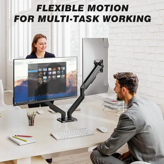 Full Motion Dual Monitor Optimizes Your ViewThe dual monitor arms can swivel ±90°,tilt for -45°to +90° and full motion of 360°. Due to its precision engineering, the monitor arm glides smoothly into any position. The design works to protect you from neck and eye fatigue associated with prolonged use. Position your monitors freely to find the optimal viewing angle for you.