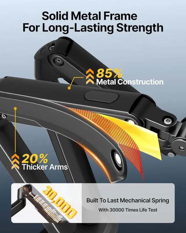 Effortless Mechanical Spring AdjustmentEquipped with dual mechanical spring arms for precise, smooth height and angle adjustments. Unlike gas springs, the mechanical system offers stable positioning with fewer failure points, keeping both monitors securely in place throughout daily use