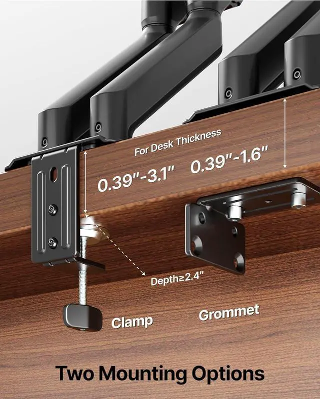 Quick Setup with Universal CompatibilityDual mounting options with C-clamp and grommet base for desks 10-80mm thick (clamp) or 10-40mm thick (grommet). Compatible with VESA 75x75 and 100x100mm mounting patterns. Ideal for home office, gaming, and professional workstationsperfect for users upgrading to dual monitors