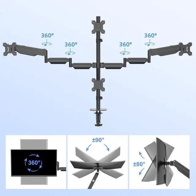 Adjustable Height: This monitor stand can adjust the height and position of the bracket arm. The arm can be adjusted forward/backward, and the VESA plate accessories connected to each screen can ±80° tilt, ±90° swing , and 360° rotation, so that you can view the four monitors vertically and horizontally.