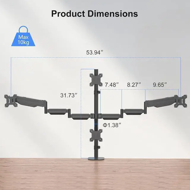 Saving Desktop Space: One advantage of this bracket is that it occupies very little space on the desktop; It is sandwiched on the back of the table, lifting the monitor from the surface of the table. If you are currently using 4 screens, this desktop stand will truly improve desktop space, and this stand can accommodate four Max 32" computer or TV screens.