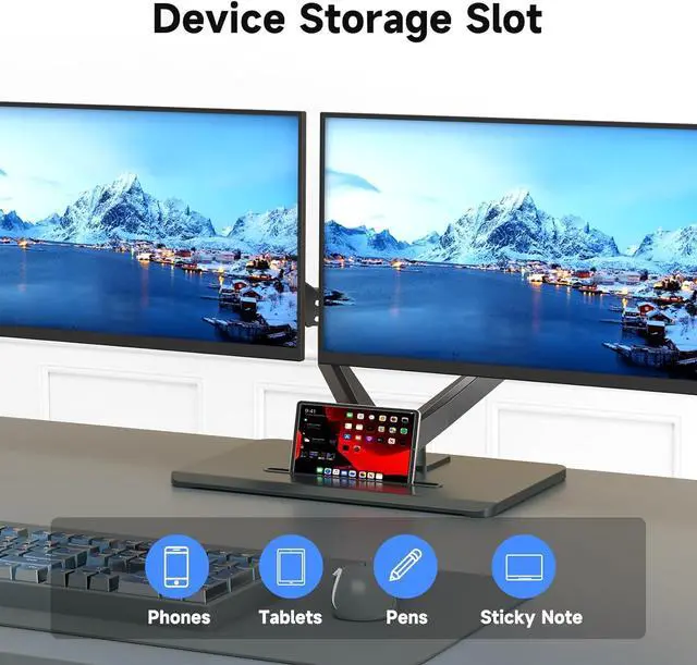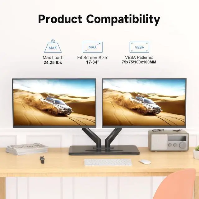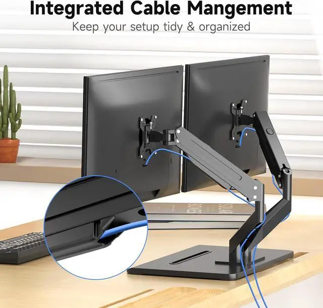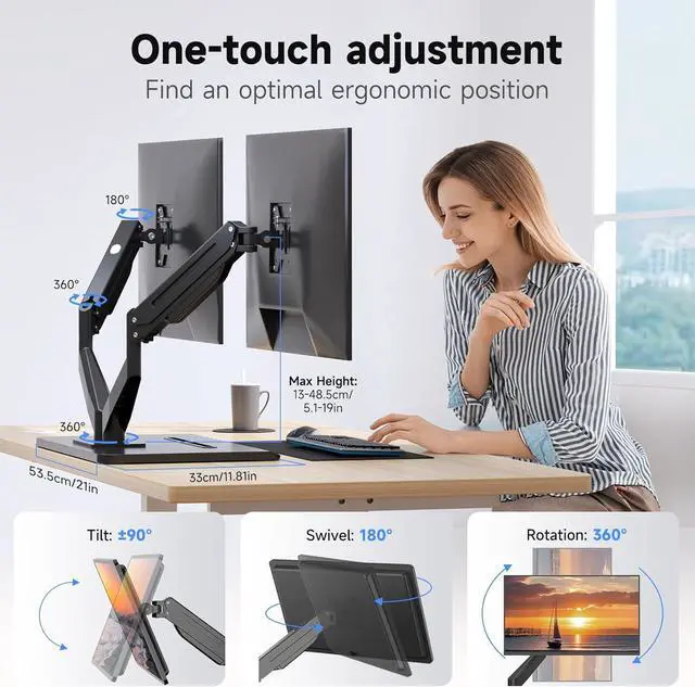 Elevate your workspace with a free-standing desk monitor stand with screens ranging from 17to 34.Crafted with a 53.5 x 33 large wooden base, this stand combines modern style with screen flexibility. Swivel, tilt, and rotate your monitor to find the perfect viewing position for more comfort.