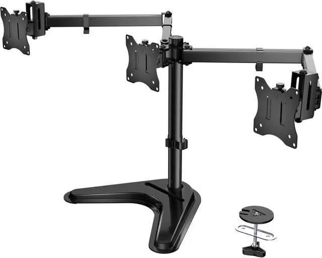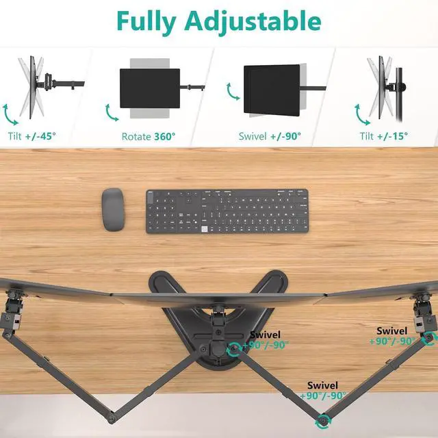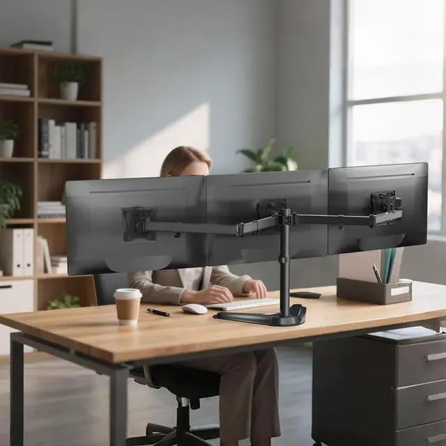 1Freestanding Base2Free Up Desk Space3Ergonomic Viewing4Work Standing/Sitting5Triple Working Efficiency1Angle Adjustment2Height Adjustment3Cable Management4Sturdy Construction5Double joint connection Comfortable Viewing Smooth cable management Secure Mounting Arms Double joint connection