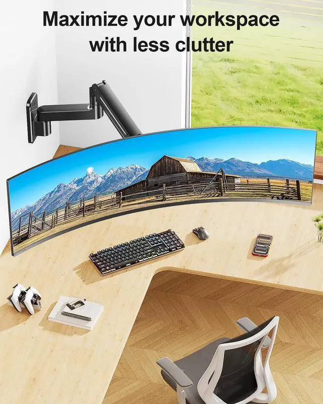 Elevate Your Monitor Save Up Your Space - Designed for simplicity and style, Mountory computer monitor wall mount lifts your ultra-wide screen off the desktop and mounts it securely on the wall at an ergonomic heightgiving you a cleaner, more spacious, and organized workspace. The sleek, adjustable arm retracts to just 5 inches when not in use, tucking neatly against the wall for a minimalist look. Built-in cable management keeps power and data cords neatly contained, eliminating messy tangles and maintaining a tidy, professional setup all day, every day. Its not just a mountits a smarter way to work.