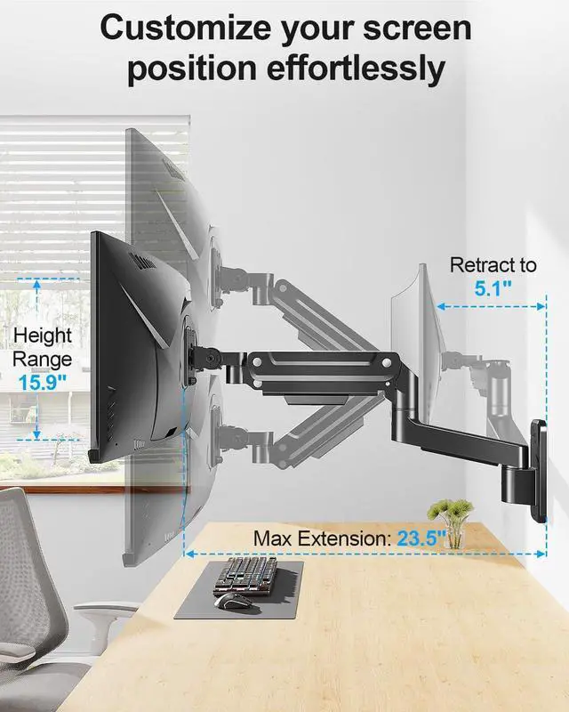 Enhanced Pneumatic Support Built for lasting performance, this VESA wall mount combines robust construction with advanced engineering. Constructed from high-quality steel and equipped with an upgraded gas spring mechanismtested to endure over 20,000 lift and tilt cyclesit delivers exceptional durability. The improved pneumatic system minimizes vibrations and wobbling during adjustments, ensuring your screen remains steady and securely positioned at all times.