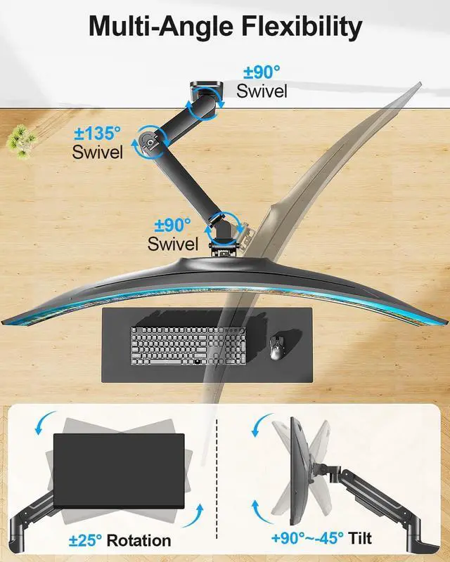 Optimized for Ultrawide Monitor - This durable, single monitor wall arm is designed to accommodate the majority of 22 to 49 flat and curved screens, delivering reliable support and flexible positioning. It holds curved monitors from 2.2 to 30.9 lbs and flat screens ranging from 2.2 to 44 lbs, making it ideal for a wide variety of ultrawide setups. Fully compatible with top brands including Samsung Odyssey G9, LG, Dell, ASUS, Acer, MSI, HP, Sceptre, and other leading models. Fits popular screen sizes such as 49", 43", 42", 39", 38", 35", 34", 32", 27", 24", and 22". Noted: The VESA adapter required for Samsung monitors is sold separately and not included with this mount.