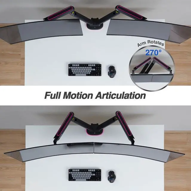 Screen Quantity:2Screen Size & Type:27 inches to 43 inches Flat / Curved / Ultra-wide 21:9 | Only supports 43" monitors (Flat/Curve) with 16:9 aspect ratio and monitor arms will be fully stretched apart. Monitor size over the recommended ratio (i.e., 21:9 or 32:9) will result in overlapping.RGB Lights:Touch button control adjustment supports up to 20 modes, including static, breathing, gradient, rainbow, chasing, flowing, stacking.Power Supply:USB 2.0 Type-A 5V/0.5AArm Capacity:11-30.8 lbs (5-14 kg) per armArm Lift:18 inches (460 mm)Arm Extend:18.7 inches (477 mm)Arm Swivel:270°VESA Tilt:Upward 40° / Downward 40°VESA Swivel:180°VESA Rotation:Portrait & Landscape viewing modesDetachable VESA Plate:Yes, support 75x75mm, 100x100mm, 200x100m or 200x200mm mounting patterns.C-clamp Mount:0.4 to 3.3 inches (10-85 mm) thick | Depth: 3.1 inches (80 mm)Grommet Mount:0.4 to 3.2 inches (10-80 mm) thick | Each Grommet Hole Diameter: 0.4 to 2.3 inches (10-60 mm)Cable Management:2 Cables per armProduct Weight:14.51 lbs (6.6 kg) How did we get our start? Enhance your gaming setup with RGB monitor arms Click Below To See Product Video AVLT Dual 43 RGB Gaming Monitor Arm Desk Mount Touch Button RGB Control Enhanced Compatibility Effortless Assembly Mechanical Tension Adjustment C-Clamp Mount Grommet Mount AVLT-DM99-1 Tech Specs