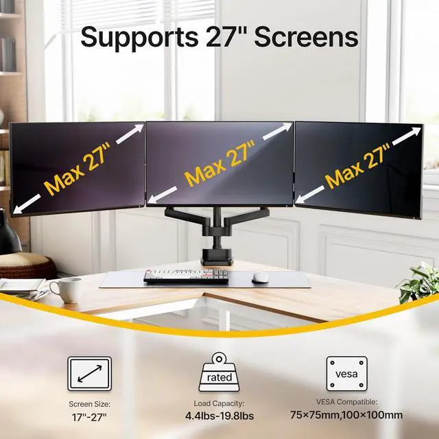 Up to three 27 inch monitors can be aligned side by side. For monitors larger than 27 inch, the monitors on both sides will be slightly inward.