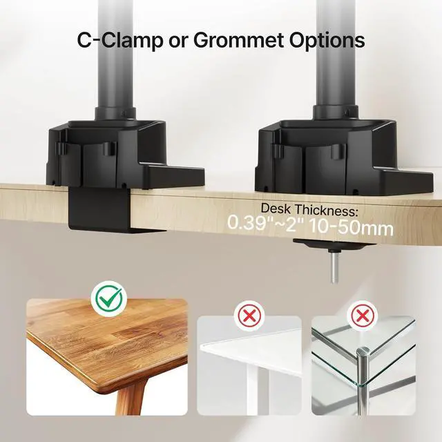 Please confirm your monitor's size is within 27", the VESA pattern is 75x75mm or 100x100mm, and the weight is 4.4-19.8lbs. Your desk has a thickness of 0.39"-1.97".