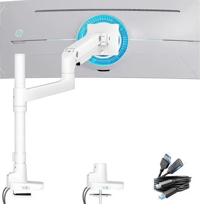 ARES WING Ultrawide Single Monitor Arm White with USB A/C, Tall Heavy Duty Monitor Arm for 17 to 49 inch Screen, Holds 44 lbs, Adjustable Gas Spring Desk Mount