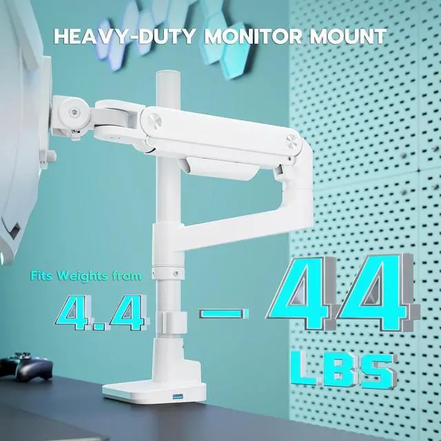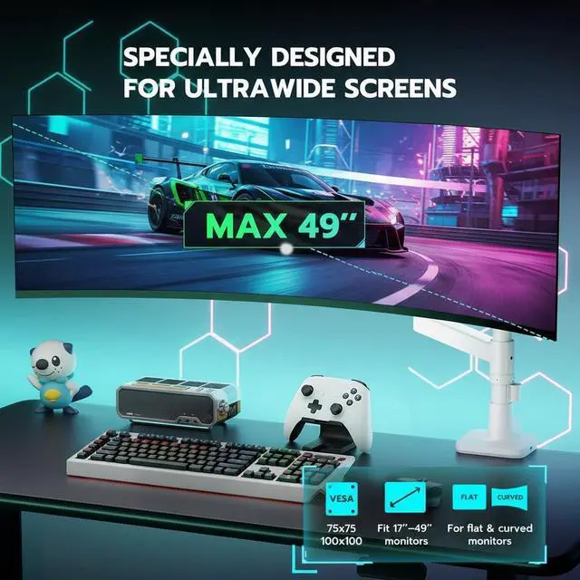 Exceptional CompatibilityThe ARES WING heavy duty monitor arm compatible with most QLED, OLED, LED flat, and curved computer monitors ranging from 17'' to 49''. ARES WING tall monitor arm can hold monitor up to 44 lbs. It is compatible with Samsung Odyssey G9, LG, and other ultrawide monitors that support VESA mounting sizes of 75×75mm or 100×100mm. You need to prepare a VESA mount adapter if your monitor does not have VESA holes.