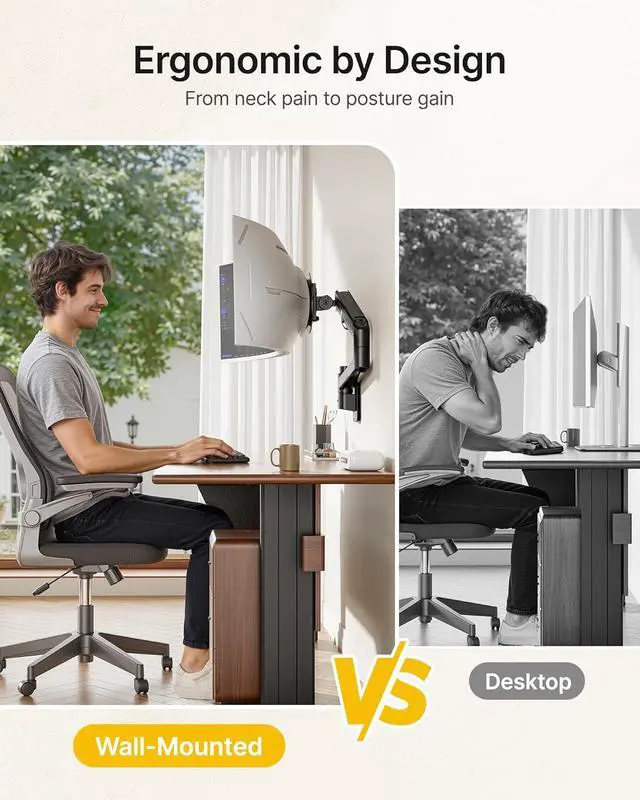 Maximum Flexibility, Minimal FootprintExperience unmatched flexibility with +75° to -75° tilt, ±90° swivel, 180° screen rotation and 11 inches of height adjustment.Extend your screen up to 27.4 inches, or fold it back to 5.2" from the wall to match your ideal posture, relieve tension, and boost productivity or gaming immersion.