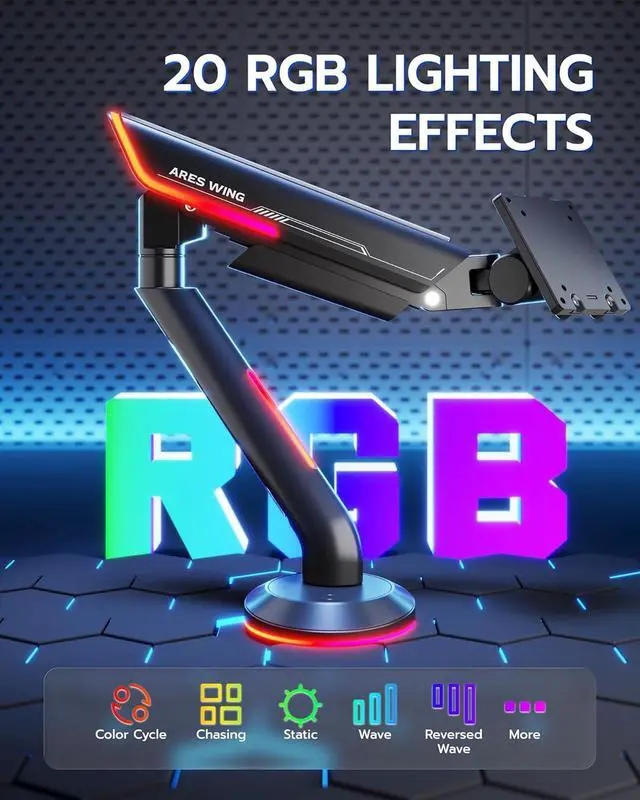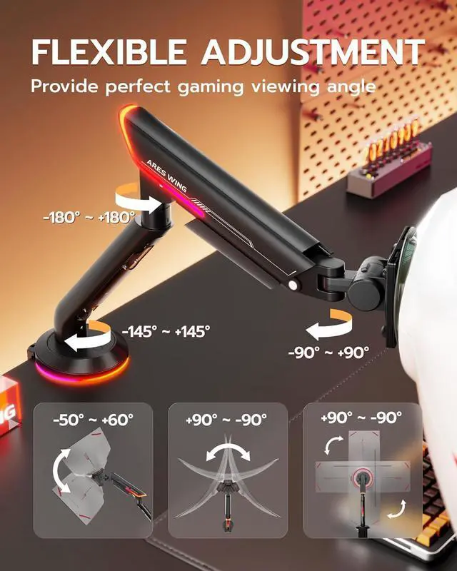 ARES WING Single Monitor Mount with RGB, Heavy-Duty Gaming Monitor Arm fits for 24"-57" Ultrawide Screen, Adjustable Computer Monitor Stand Holds Up to 60LBS with VESA Mount, Clamp & Grommet, Black