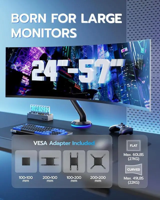 • Ultra-Wide Compatibility & Flexible Positioning: Supports 24"57" screens up to 60 lbs (49 lbs for curved), offering greater adaptability than standard arms. With +60° to 50° tilt, +90° to 90° swivel, and 360° rotation, you can fine-tune your monitor for any gaming posture. Fully compatible with multiple VESA sizes, this mount ensures smooth, precise positioning for both pro setups and immersive gaming
