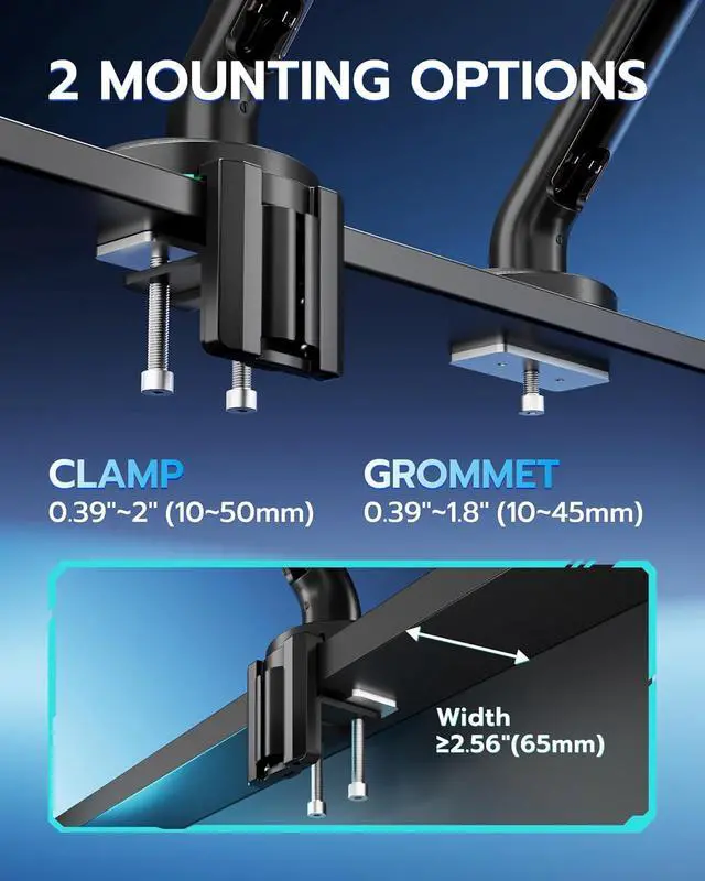 • Hassle-Free Setup in Minutes: This monitor arm offers two installation optionsClamp (1050mm) and Grommet (1045mm)providing a secure fit for most desks. With universal VESA support (75x75, 100x100, 100x200, 200x100,