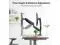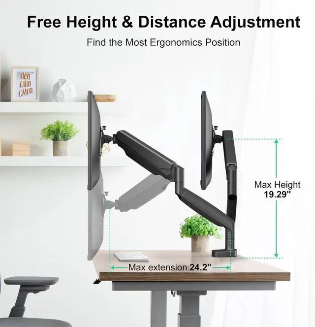 Fully AdjustableThe dual monitor mount allows 2 screens to tilt +90°/-45°, swivel 180° and rotate 360°. The gas spring arm can be extended forward up to 22.8" and adjusted to a maximum height of 20" Easily find an optimal ergonomic posture, relieve strain on spine, neck, and shoulders.