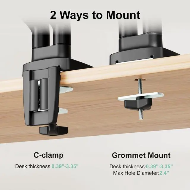 Two Mounting OptionsDepending on your desk situation,choose C-clamp (drill-free, compatible with desk thickness of 0.39"-3.35") or grommet mount (a hole diameter of up to 2.4").With clear instructions and all necessary mounting hardware,even without any installation experience,it can be assembled in 15 minutes.