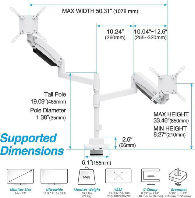 For Monitor Size: 17" to 57" & Monitor Weight: Under 59.5lbs (27kg) (per arm)