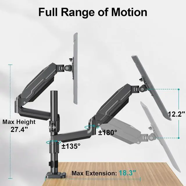 The two gas spring monitor arm can adjust monitor height (adjustable height range: 12.2"). The height adjustable two monitor desk mount ergonomic design helps to improve work posture to increase productivity and comfort.