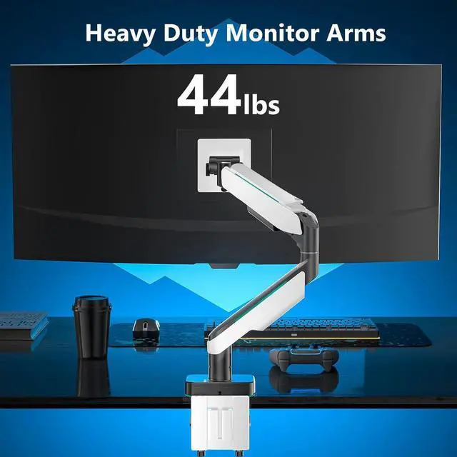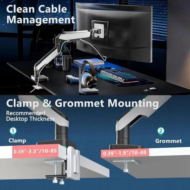 Design: The monitor arm fits ultrawide or curved LCD/LED screen from 17 to 49, gaming monitor arm support up to 44lbs with 75x75mm and 100x100mm mounting holes. The two-stage locking system compatible with 0.39"-3.3"/0.39"-1.9"thick desk for both C-clamp and grommet base