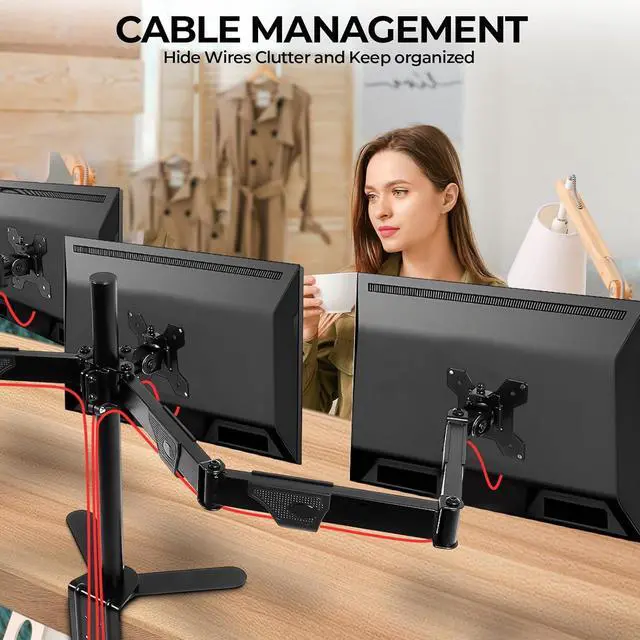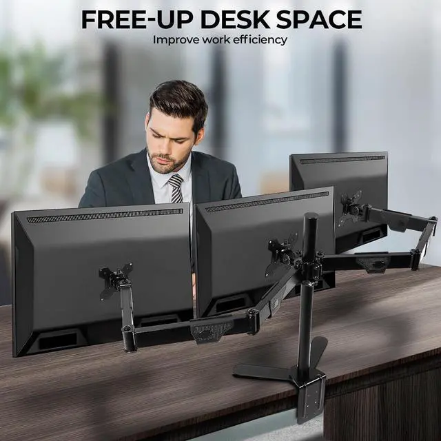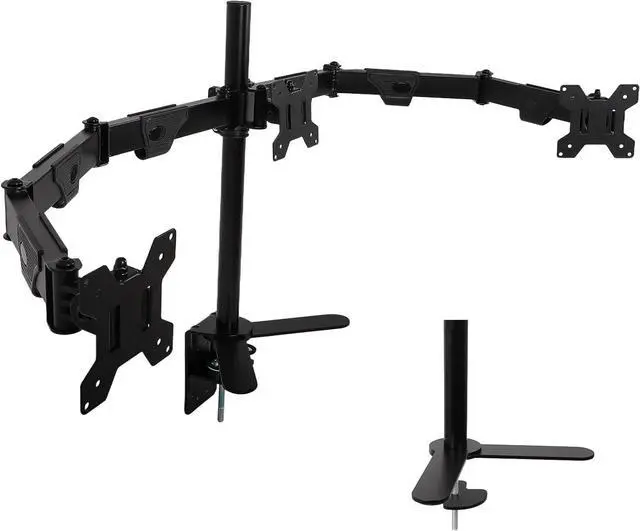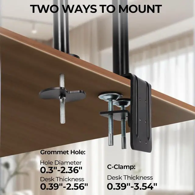:3 monitor desk mount provides two installation methodsUse the desktop clamp or grommet mounting method to fit your needs, and you can have a three-screen setup in less than 15 minutes.