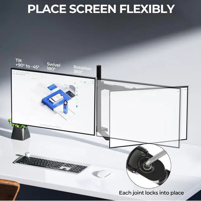 & :Designed for stability and strength, our heavy-duty VESA monitor mount holds your monitor securely, with each monitor arm supporting up to 19.8 lbs, ensuring your devices remain secure and properly positioned.