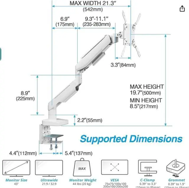 Fits Ultra Wide Screens - Single mount for ultra-wide monitors up to 49 in size and 44 lbs in weight. The quick-release VESA bracket features 75x75mm and 100x100mm mounting capability, and the stand secures to desks up to 3.3 thick with the heavy-duty C-clamp or 1.9 with the optional grommet mount.