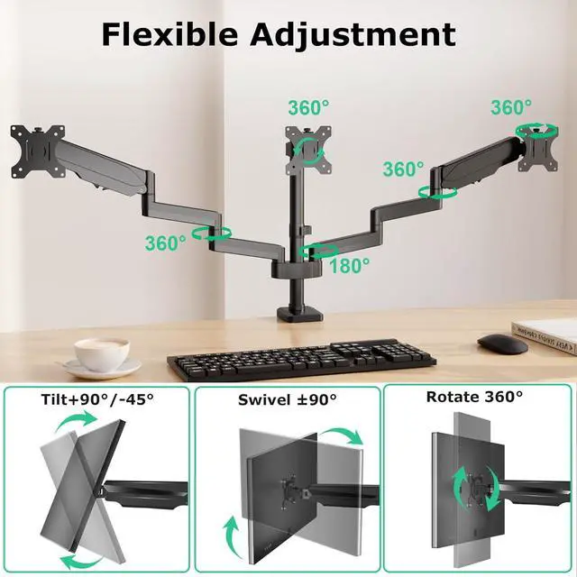 Desk Space SaverThe triple monitor stand mount get 3 monitors off your desk and help you get a lot of desktop space. Integrated cable management system keeps your power and AV cords organized. Just enjoy your time working, playing or watching in a clean and comfortable environment.
