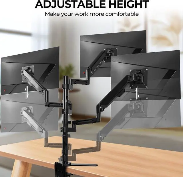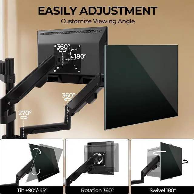** **Our adjustable monitor stand offers 360° rotation, ±90° tilt, and 180° swivel, a gas spring mechanism ensures smooth adjustment, allowing you to easily customize your viewing angle, and each monitor arm moves independently so you can arrange your screen portrait or landscape orientation.